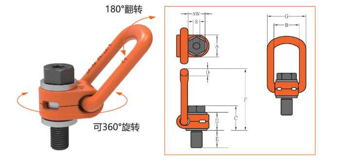 冠航2.5噸側拉旋轉吊環的設計允許在水平方向上進行360度旋轉和垂直方向上的180度翻轉,提供了更大的靈活性和自由度。YD081側拉吊環可以用于連接各種索具,使連接點在各個方向上都具有靈活性,適應不同的吊裝需求。在需要旋轉的設備或機械結構中,側拉旋轉吊環可以作為連接點,提高操作效率。