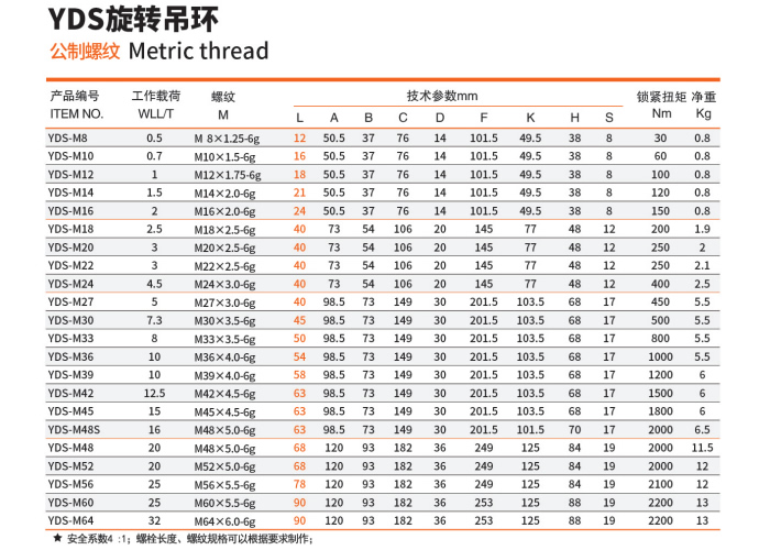 冠航YDS旋轉吊環是一種設計先進的吊裝工具,專為提供高強度和多功能性而設計。M22它能夠安全地承載高達3000公斤的重量,非常適合重型工業吊裝作業。這種旋轉吊環具備360度的水平旋轉能力,以及上下180度的翻轉自由度,使得在狹窄或限制性空間內操作時更加靈活方便。